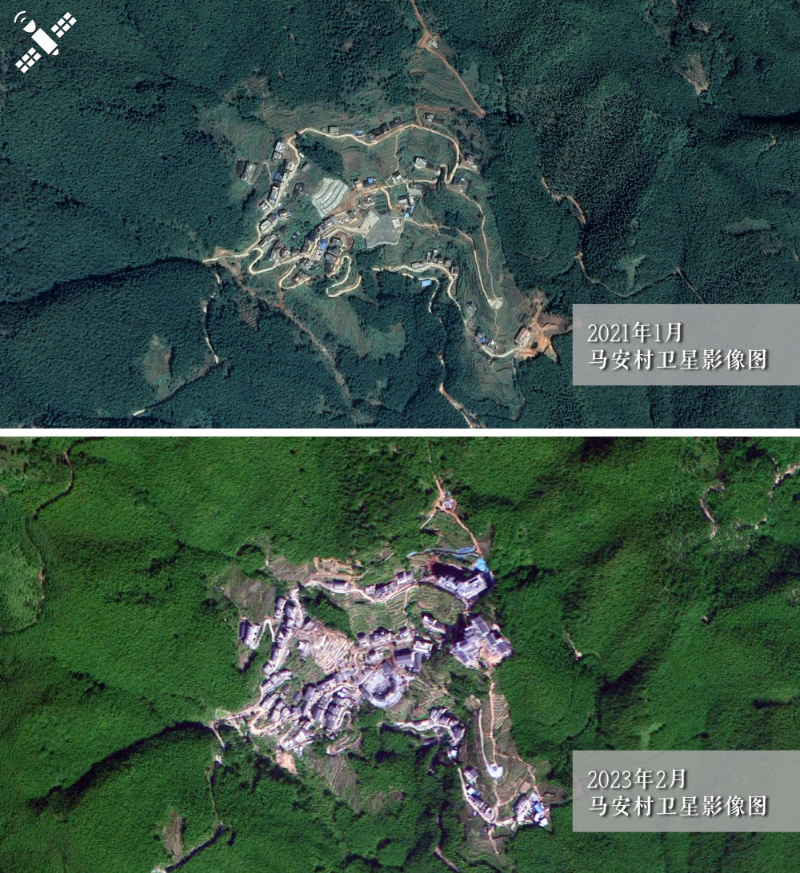 解读:2021年1月村落原貌(上图)对比2023年2月新貌(下图),马安村文旅建筑群规模显现。