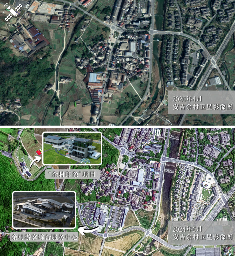 解读:2020年4月原貌(上图)对比2024年6月新貌(下图),安吉余村将废弃厂房改造为“余村印象”项目,并建成余村游客综合服务中心。
