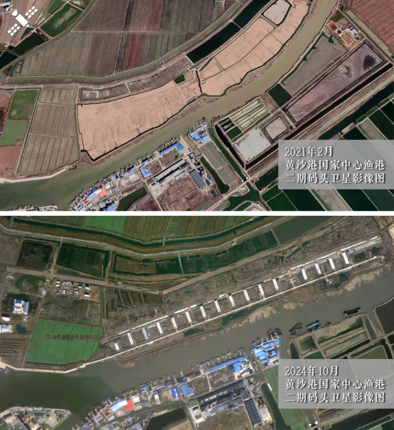 解读:2021年2月施工初期(上图)对比2024年10月(下图),黄沙港国家中心渔港二期工程码头主体已建成。