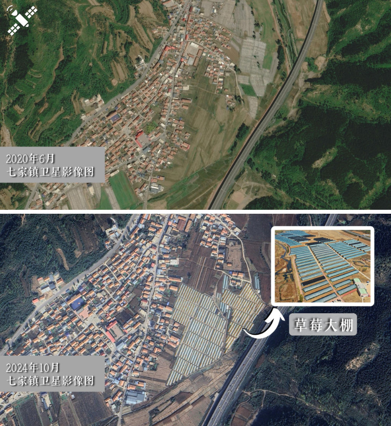 解读:对比2020年6月(上图),2024年10月七家镇连片温室草莓大棚卫星图中的反光区域显著增加(下图)。
