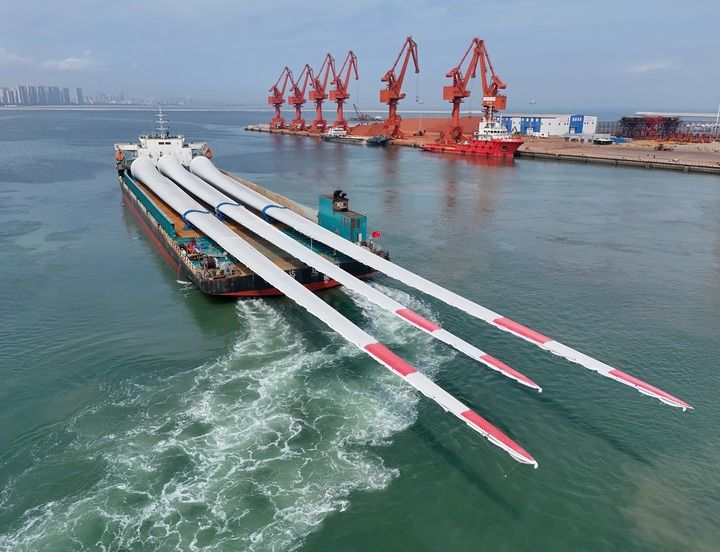 2025年8月1日,超大尺寸海上风电叶片从山东港口烟台港蓬莱港区起运(无人机照片)。新华社发(唐克摄)